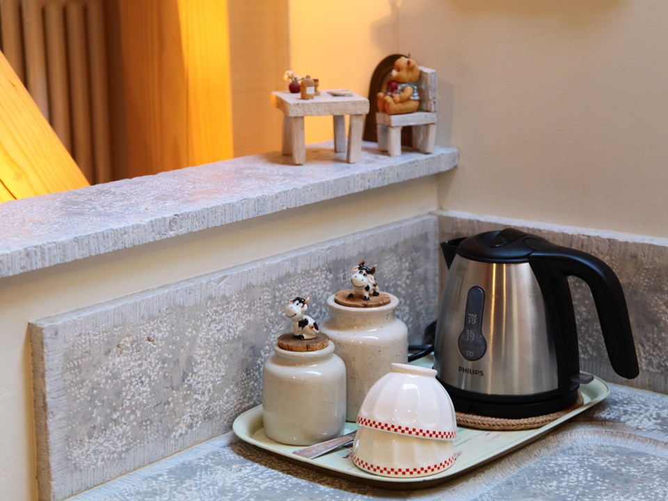 un coin-cuisine pour vos petites collations (réfrigérateur, four micro-ondes, bouilloire électrique, table, tabourets...)